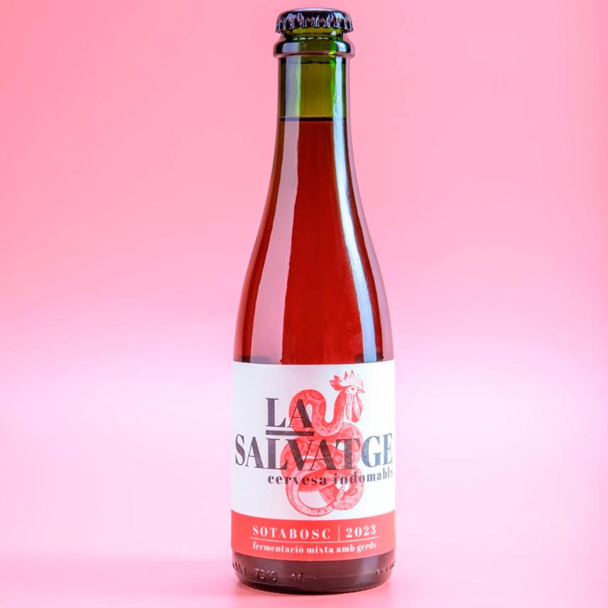 Cerveza de fermentación espontánea, fermentada 12 meses en barricas de vino blanco y refermentada con frambuesas y levaduras salvajes del Puig de Llaés, Ripoll, Girona.